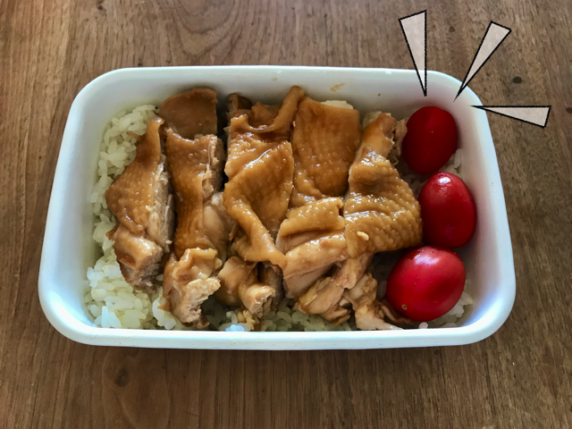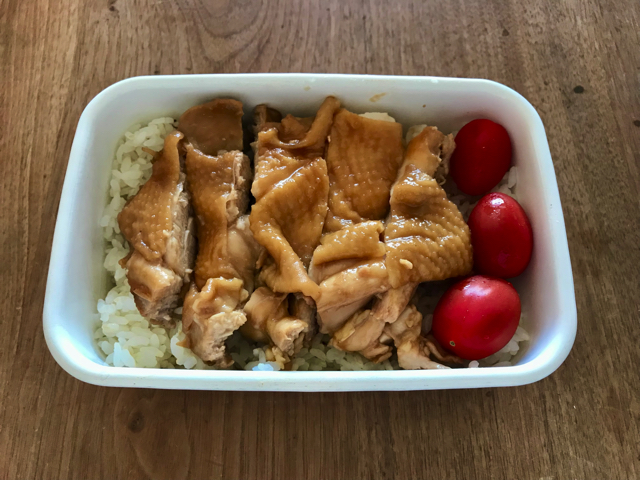 タッパーに詰めた大盛りご飯の上に、鶏モモ肉の照り焼きを乗せるのみ。